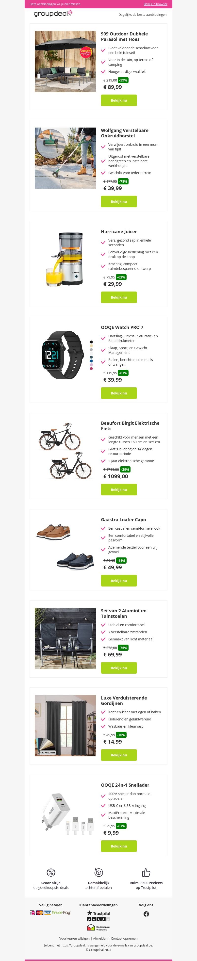 Mis deze geweldige aanbiedingen niet! Krijg een 909 Outdoor Dubbele Parasol met Hoes vanaf €89,99, een Wolfgang Verstelbare Onkruidborstel voor €39,99 en de Hurricane Juicer vanaf €29,99. Ontdek ook andere fantastische producten zoals de OOQE Watch PRO 7, Beaufort Birgit Elektrische Fiets, Gaastra Loafer Capo, en veel meer!