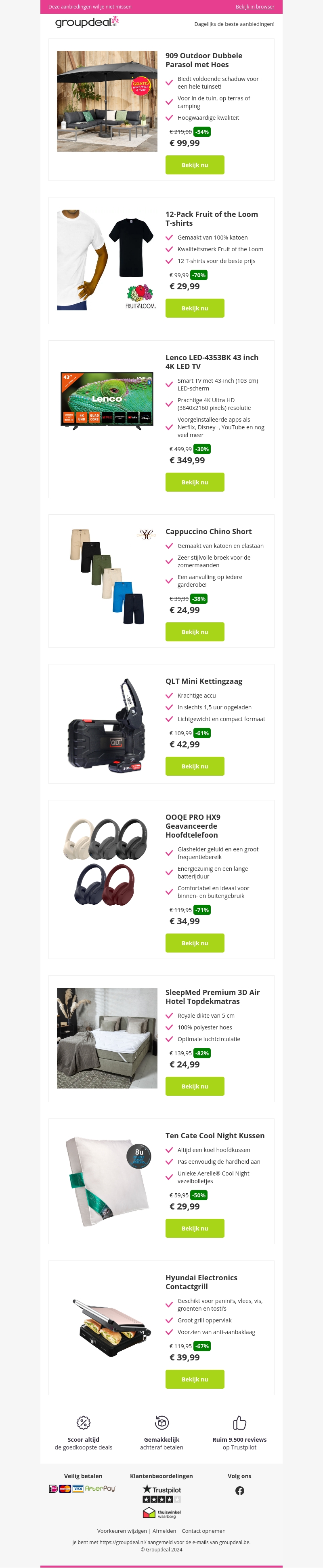 Profiteer van de nieuwste aanbiedingen op mailaanbiedingen.nl! Kies uit een $909 Outdoor Dubbele Parasol met Hoes vanaf 99,99, een 12-Pack Fruit of the Loom T-shirts voor maar 29,99 en een Lenco LED-4353BK 43 inch 4K LED TV vanaf 349,99. Mis deze deals niet!