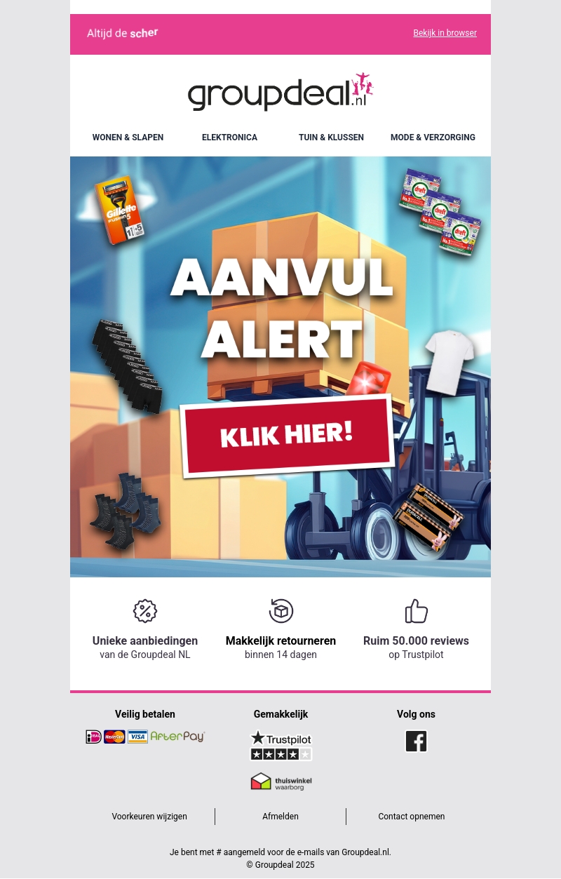 Groupdeal presenteert een speciale Aanvul Alert met nieuwe voorraad van topmerken. Profiteer van exclusieve deals op diverse producten zoals elektronica en verzorgingsartikelen. Met eenvoudig retourneren en veilige betaalopties is winkelen nog nooit zo aantrekkelijk geweest. Bekijk nu de nieuwste aanbiedingen en bespaar meer.