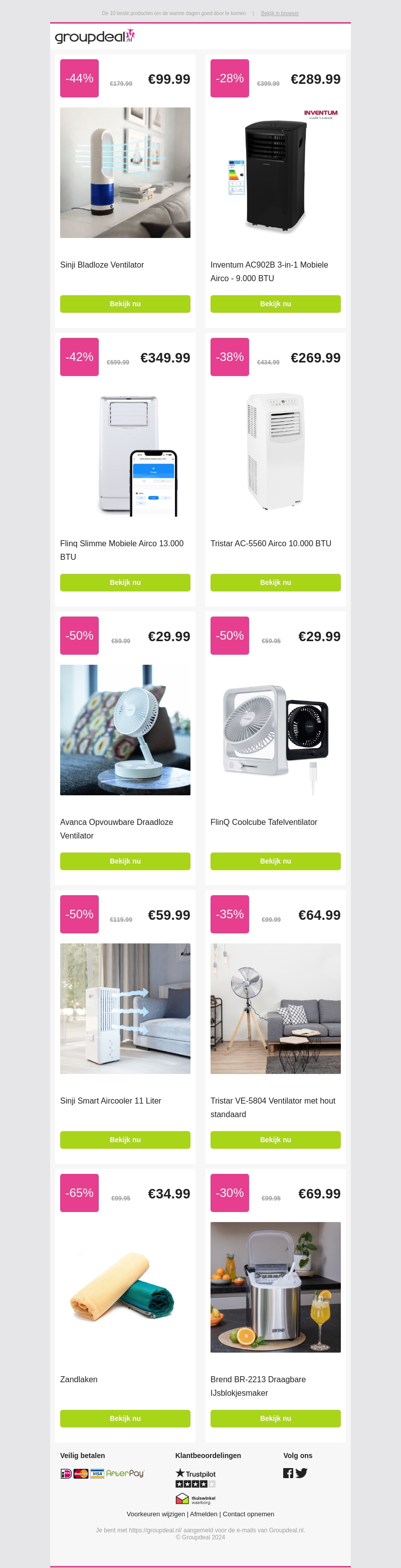Bekijk de top 10 producten om de warme dagen goed door te komen bij Groupdeal. Van bladzware ventilatoren tot mobiele airconditioners, zorg ervoor dat je huis aangenaam blijft. Ontvang hoge kortingen op al je favoriete producten!