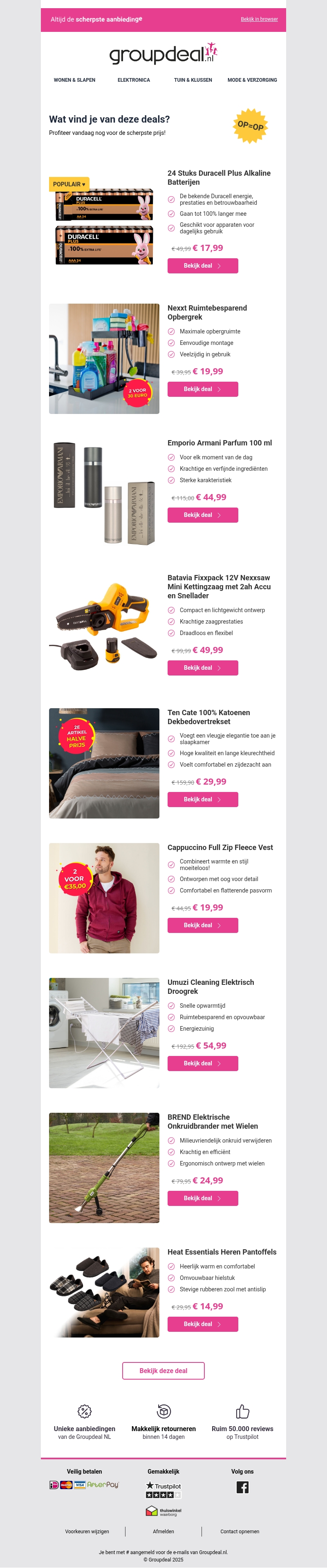 Ontdek aantrekkelijke aanbiedingen in de nieuwste nieuwsbrief van Groupdeal. Van essentiële batterijen tot stijlvolle vesten en comfortabele pantoffels, er is voor ieder wat wils. Profiteer van de kwaliteit en scherpe prijzen van topmerken. Vergeet niet de korting op parfum en praktische huishoudelijke apparaten. Haal vandaag nog voordeel uit deze exclusieve deals. Mis ze niet!