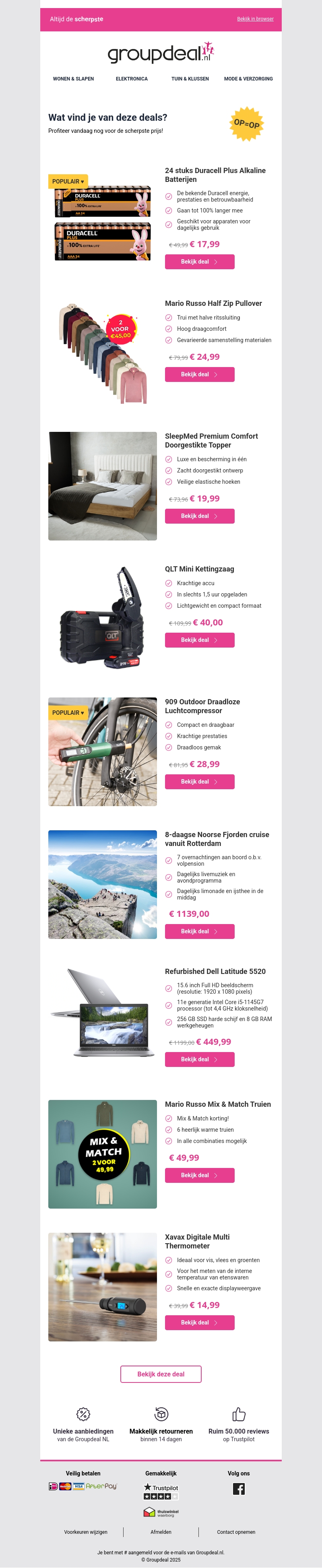Verken de nieuwste aanbiedingen van Groupdeal, waaronder Duracell batterijen, stijlvolle truien en meer. Profiteer van hoge kortingen op duurzame producten en exclusieve reisdeals. Mis deze kans niet om kwaliteitsproducten voor een lage prijs te bemachtigen. Bekijk direct de deals en bespaar!