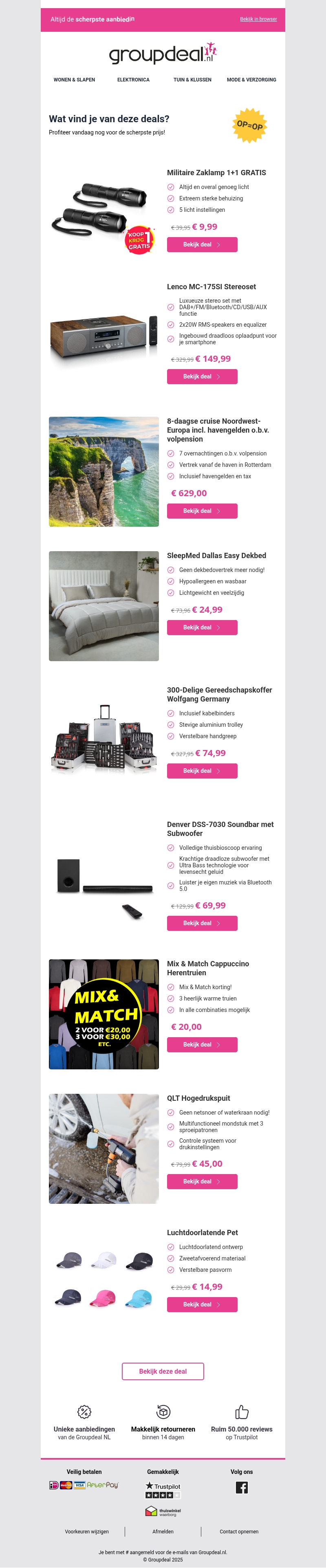 Profiteer van fantastische kortingen op een breed scala aan producten bij GroupDeal. Vind deals op militaire zaklampen, stereosets, exotische vakanties, comfortabele dekbedden en nog veel meer. Elke aanbieding biedt unieke voordelen die zowel praktisch als kostenefficiënt zijn. Mis de kans niet om je favoriete producten tegen een gereduceerde prijs in handen te krijgen. Of je nu op zoek bent naar elektronica, huisartikelen of mode, er is voor ieder wat wils!