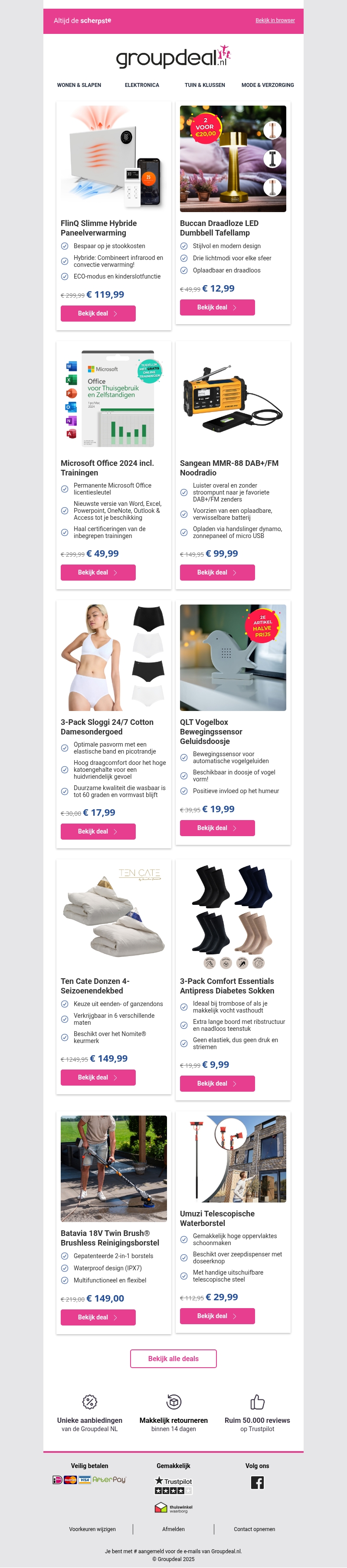 Deze week biedt Groupdeal een scala aan spannende deals, van slimme paneelverwarming en draadloze tafellampen tot Microsoft Office trainingen. Ontdek praktische producten zoals de Sangean DAB+ radio, comfortabele Sloggi ondergoedsets, en duurzame dekbedden van Ten Cate. Profiteer van scherpe prijzen en exclusieve aanbiedingen. Mis snel je kans niet om te besparen met deze superdeals!