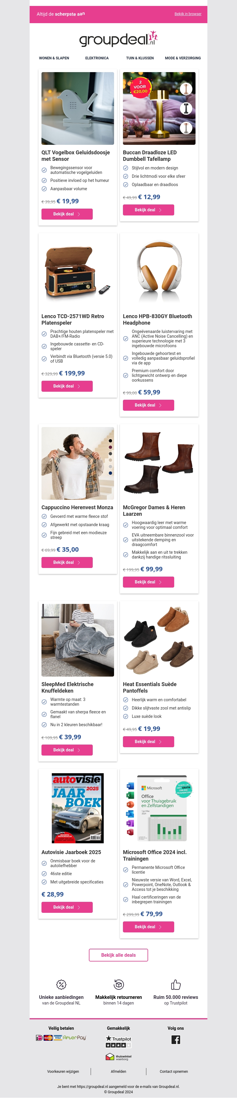 Deze week biedt Groupdeal een reeks aantrekkelijke aanbiedingen, variërend van elektronische gadgets tot stijlvolle modeartikelen. Profiteer van kortingen op QLT Voicebox Geluidsdoosje en Bucan Draadloze LED Tafellamp. Ontdek ook de luxe McGregor laarzen voor dames en heren. Ideaal voor wie op zoek is naar kwaliteit en besparing.