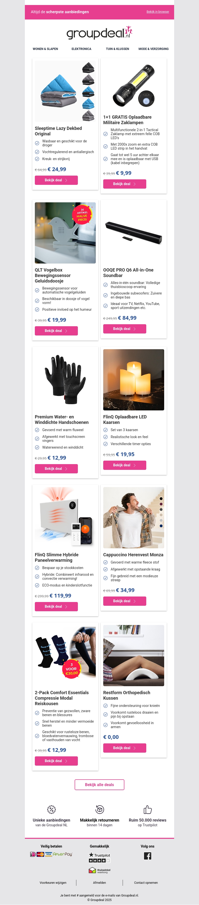 Deze week presenteert Groupdeal.nl een reeks fantastische aanbiedingen in verschillende categorieën zoals wonen, elektronica, tuin en mode. Geniet van kortingen op producten zoals dekbedden, zaklampen en innovatieve gadgets. Ontdek ook de voordelen van slimme verwarmingssystemen en comfortabele kleding. Mis deze kans niet om topkwaliteit producten tegen verlaagde prijzen te scoren. Blijf op de hoogte van alle deals en bespaar vandaag nog.