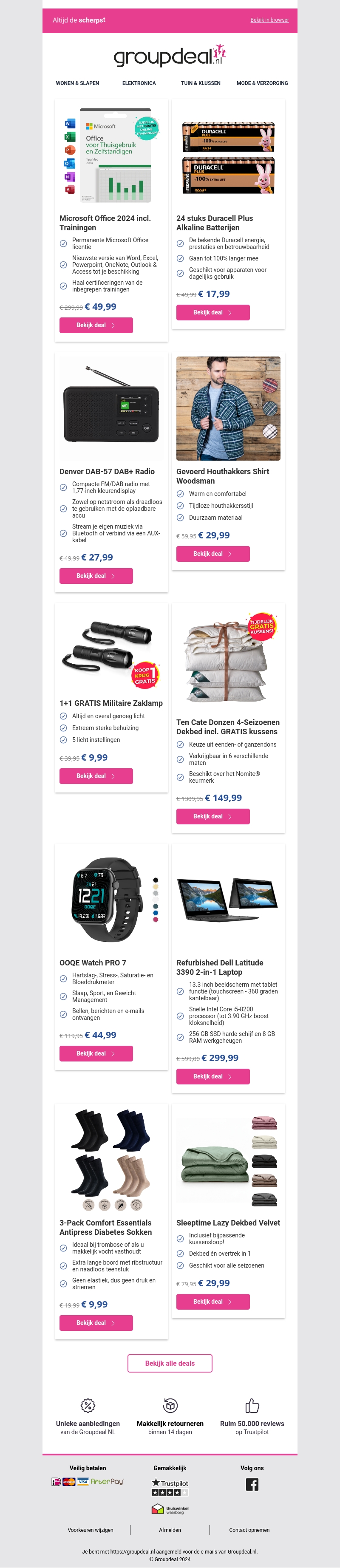 Mis de nieuwste aanbiedingen en kortingen van Groepdeal.nl niet! Deze week hebben we geweldige deals op Microsoft Office, duurzame batterijen, en de nieuwste technologie zoals de OQOE Watch PRO 7. Of je nu op zoek bent naar comfortabele mode of praktische gadgets, wij hebben iets voor jou.