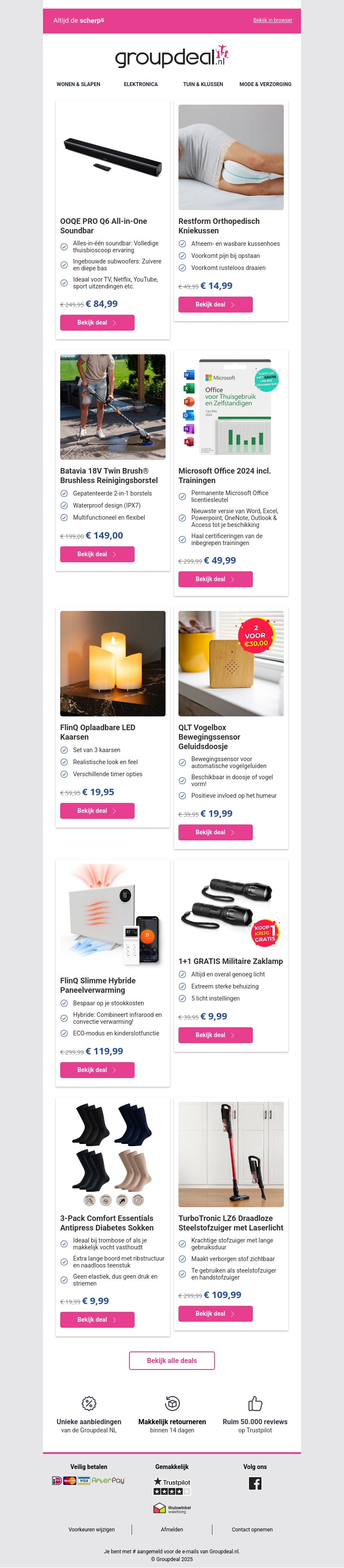 Deze week biedt Groupdeal.nl een reeks spectaculaire kortingen. Van geavanceerde elektronica tot comfortabele woonaccessoires. Mis de speciale deals op Microsoft Office trainingen en slimme verwarmingssystemen niet. Verrijk je huis met kwaliteitsproducten tegen ongeëvenaarde prijzen.
