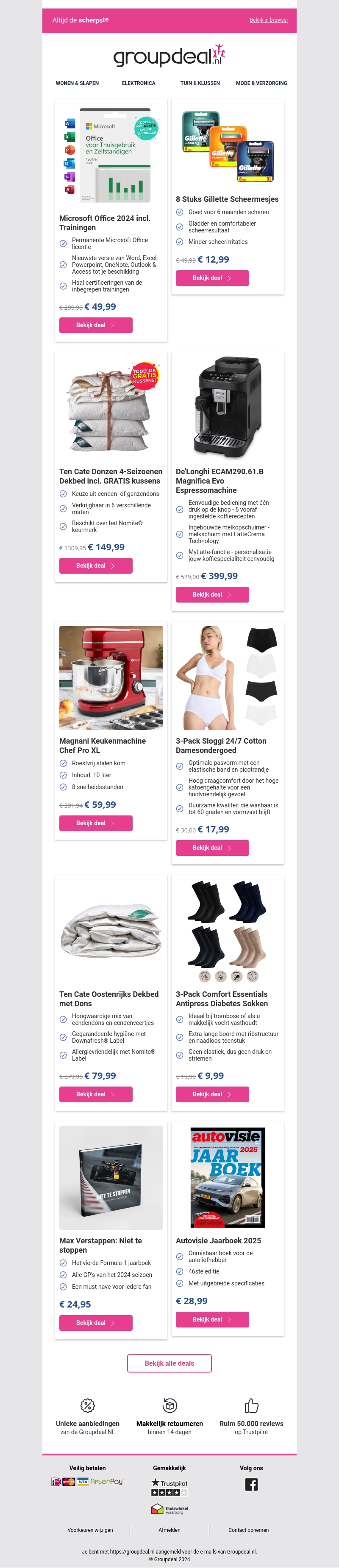 Duik in de geweldige deals van deze week met kortingen op Microsoft Office, razors, beddengoed en meer. Mis de keukenmachine en damesondergoed aanbiedingen niet. Profiteer nu van topaanbiedingen op Groupdeal.nl!