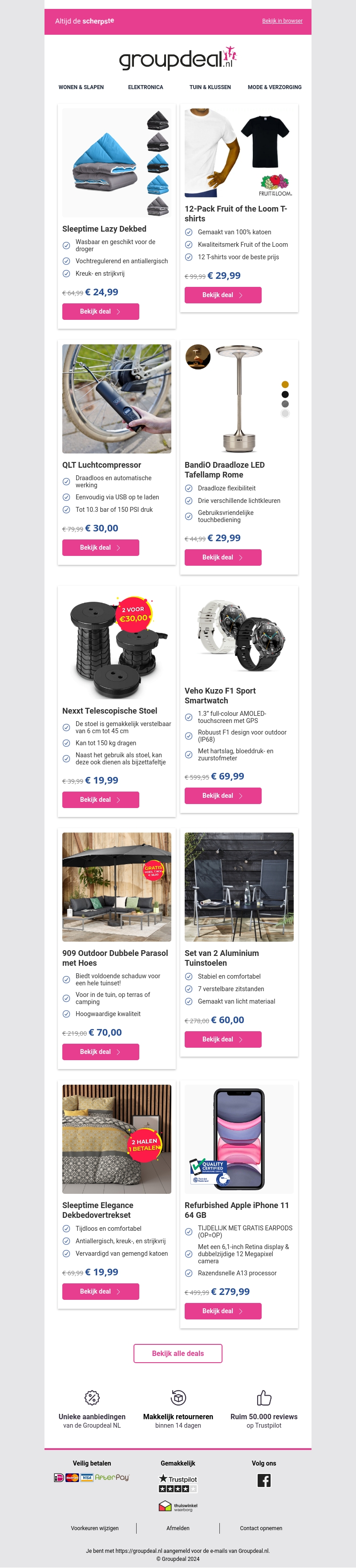 Doe mee met de geweldige deals van deze week op Groupdeal.nl! Van comfortabele beddengoed artikelen, praktische elektronische gadgets tot mode voor alle gelegenheden. Ontvang flinke kortingen en unieke aanbieding op geselecteerde producten. Bekijk de deals en bespaar vandaag nog. Mis de specials niet!