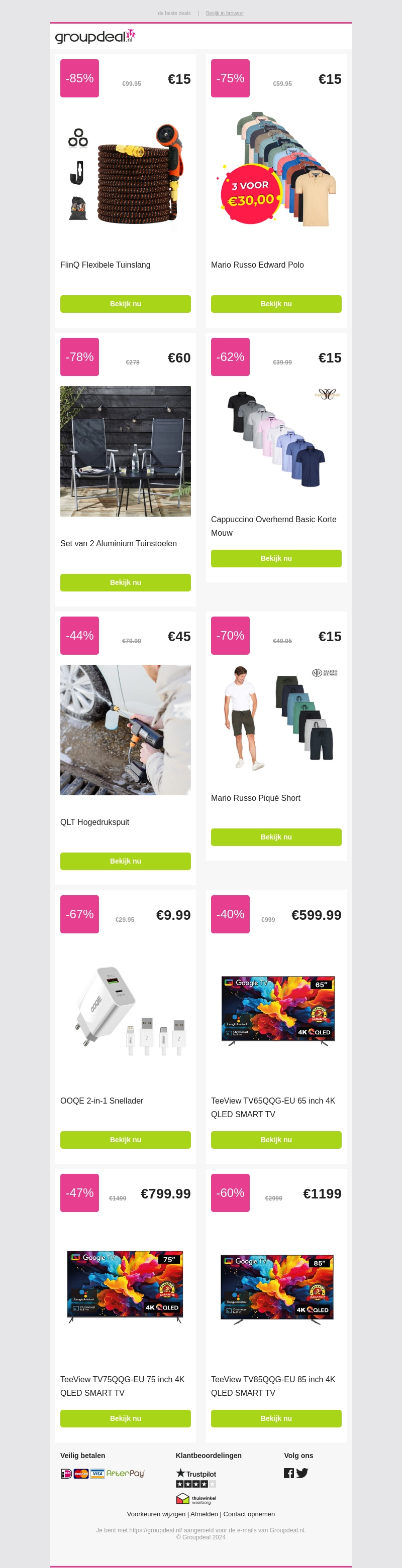 Bekijk de top 10 aanbiedingen van deze week en bespaar tot wel 85%! Van flexibele tuinslangen en stijlvolle polo’s tot slimme snelladers en QLED SMART TV’s, deze deals mag je niet missen.