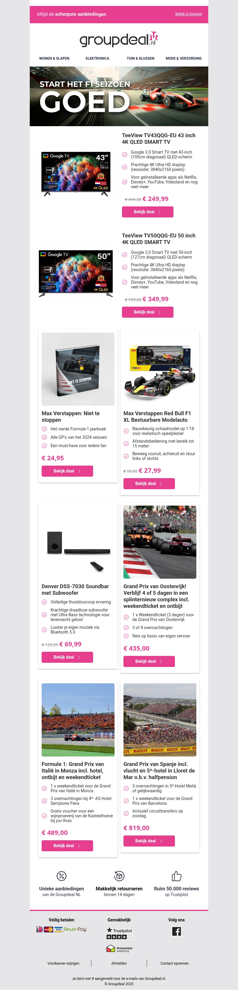 Het nieuwe F1-seizoen staat voor de deur en wij hebben de beste deals voor je! Van de nieuwste Google Smart TV's tot exclusieve Formule 1-verblijven. Mis het niet en ontdek hoe je je F1-beleving kunt verbeteren met onze aanbiedingen.