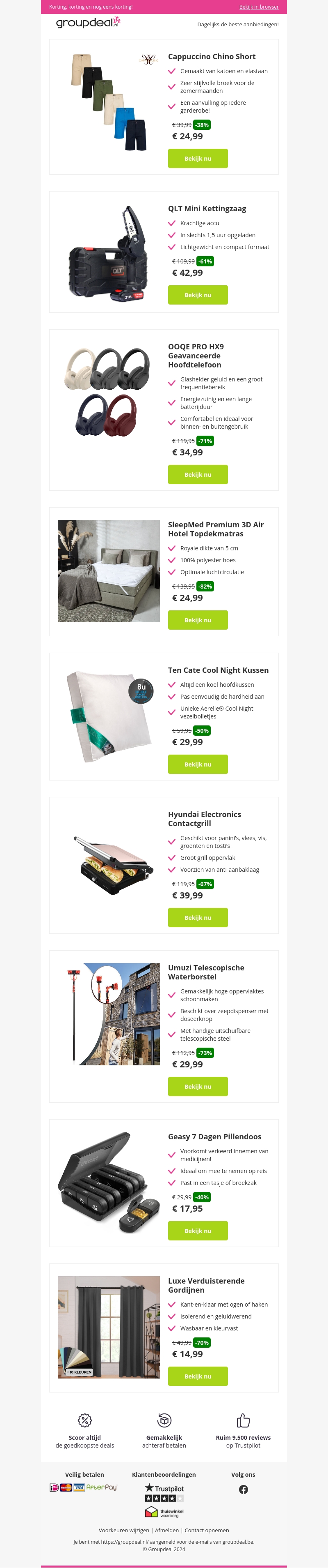 Deze nieuwsbrief biedt u geweldige aanbiedingen op Cappuccino Chino Shorts, QLT Mini Kettingzaag, OOQE PRO HX9 Hoofdtelefoon, luxe beddengoed en nog veel meer! Profiteer van kortingen die oplopen tot 82% en vernieuw uw garderobe of huis zonder de bank te breken.