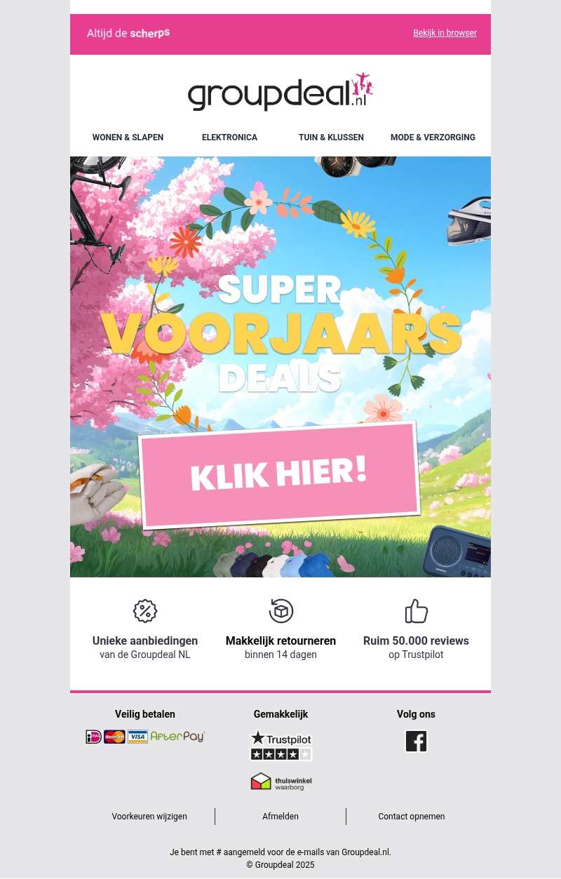 Duik in de lente met de fantastische voorjaarsdeals van Groupdeal. Van elektronica tot mode, er is voor ieder wat wils. Geniet van unieke aanbiedingen met een gemakkelijke retourmogelijkheid binnen 14 dagen. Met duizenden tevreden reviews op Trustpilot kunt u veilig en met vertrouwen winkelen. Mis deze kans niet en klik om de deals te ontdekken!