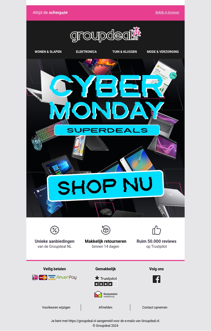 Vier Cyber Monday met ongekende superdeals bij Groupdeal. Scoor hoge kortingen op elektronica en meer. Mis deze kans niet om jouw favoriete producten tegen de beste prijzen te krijgen. Met veilige betalingsmogelijkheden en makkelijke retouren binnen 14 dagen. Lees wat anderen vinden met meer dan 50.000 reviews op Trustpilot.