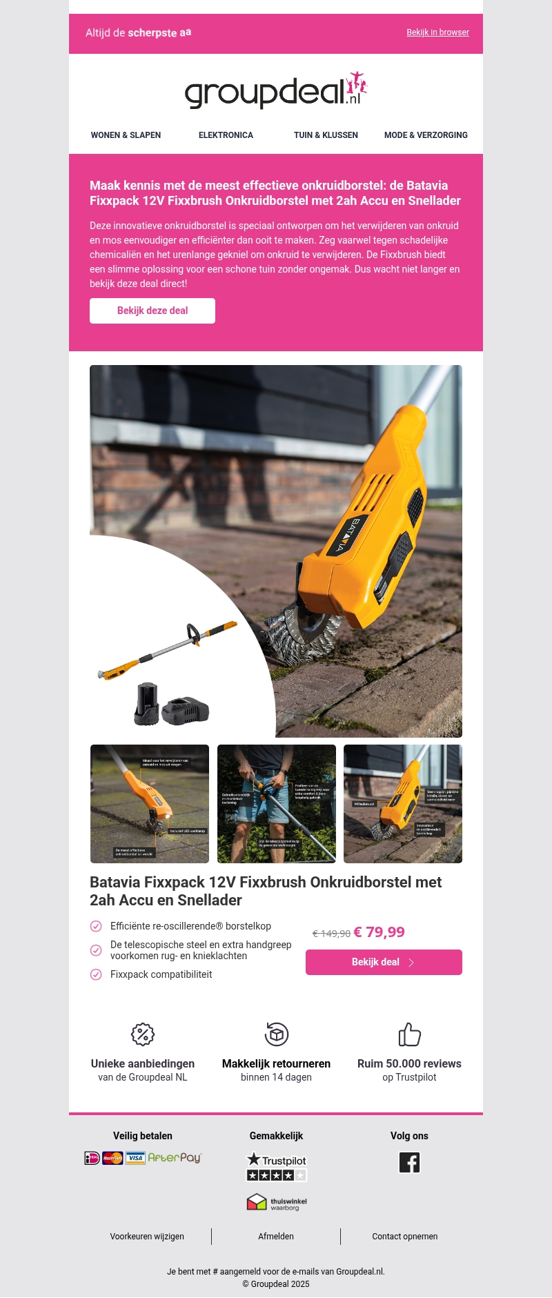 De Batavia Fixxpack 12V Fixxbrush onkruidborstel is ontworpen om effectief en efficiΓ«nt onkruid te verwijderen zonder chemicaliΓ«n. Met een krachtige 2Ah accu en snellader, biedt deze onkruidborstel een eenvoudige oplossing voor een schone tuin. De telescopische steel en extra handgreep maken het gebruik comfortabel en voorkomen rugklachten.
