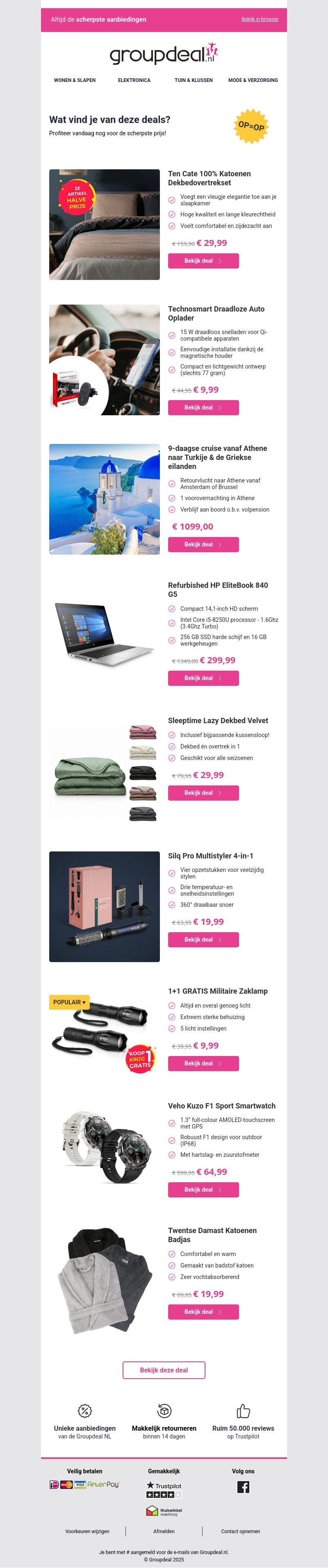 Deze nieuwsbrief biedt een scala aan deals die je niet wilt missen! Van katoenen dekbedovertrekken tot een handige draadloze autolader. Ervaar de charme van een cruise naar de Griekse eilanden of vind de perfecte refurbished laptop voor je behoeften. Profiteer van een gratis militaire zaklamp en ontdek de Veho Kuzo F1 smartwatch voor elke avontuurlijke dag.