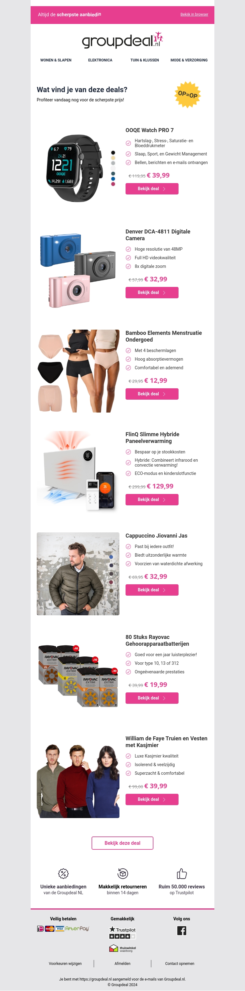 Deze week heeft Groupdeal onweerstaanbare aanbiedingen op diverse producten zoals de OQOE Watch PRO 7, de Denver DCA-4811 Digitale Camera en stijlvol menstrueel ondergoed. Profiteer van kortingen op hybride paneelverwarming en modieuze kledingkeuzes die passen bij elke gelegenheid. Mis ook de kans niet om batterijen en luxe kashmier truien in te slaan tegen scherpe prijzen.