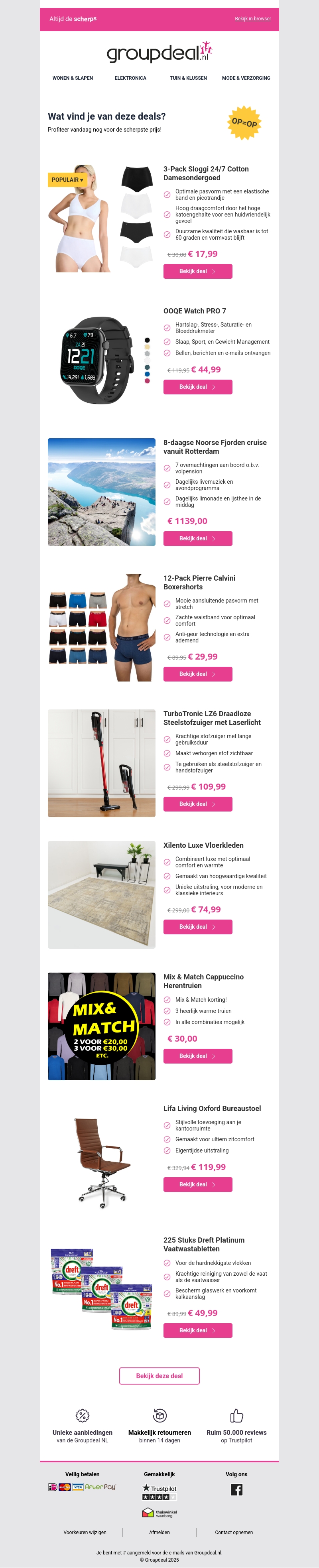 Deze nieuwsbrief van Groupdeal.nl biedt een scala aan spannende kortingen op diverse producten, van mode tot elektronica en huisdecoratie. Ontdek de nieuwe aanbiedingen, zoals de 3-pack Sloggi damesshorts of de OOQE Watch PRO 7. Profiteer van de scherpe prijzen en geniet van praktische aanbiedingen, waaronder een 8-daagse cruise of luxe vloerkleden. Mis je kans niet op slimme deals en bespaar vandaag nog!