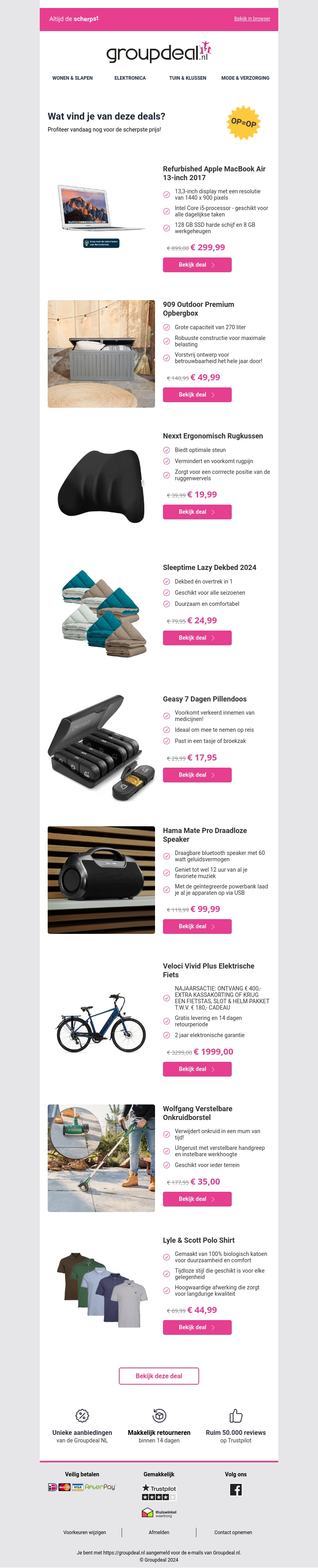 Ontdek de nieuwste deals op GroupDeal.nl! Profiteer van de beste kortingen op een refurbished Apple MacBook, premium opbergboxen, ergonomische rugkussens en nog veel meer. Mis deze aanbiedingen niet!