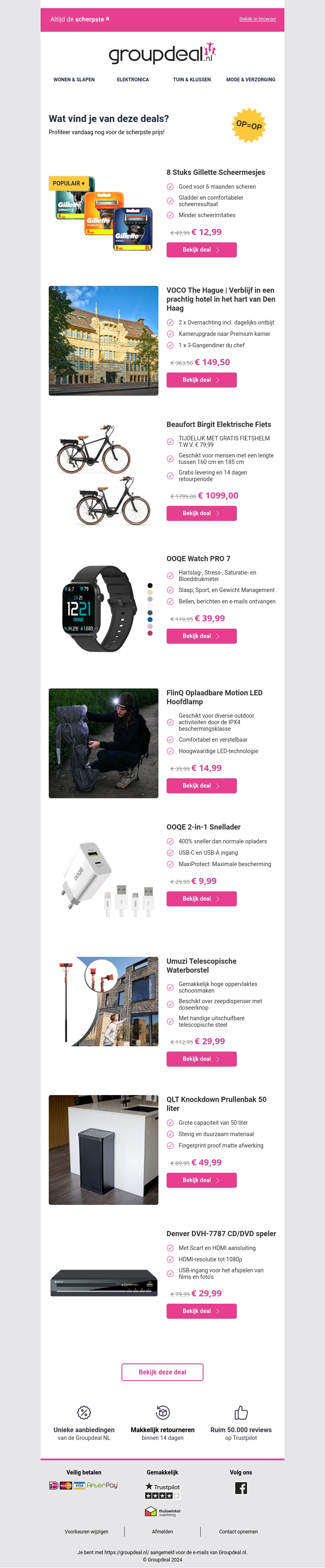 Wat vind je van deze deals? In de nieuwste nieuwsbrief van Groupdeal.nl vind je scherpe aanbiedingen die je niet wilt missen. Van Gillette scheermesjes en elektrische fietsen tot smartwatches en teleschopische waterborstels - er is voor ieder wat wils!
