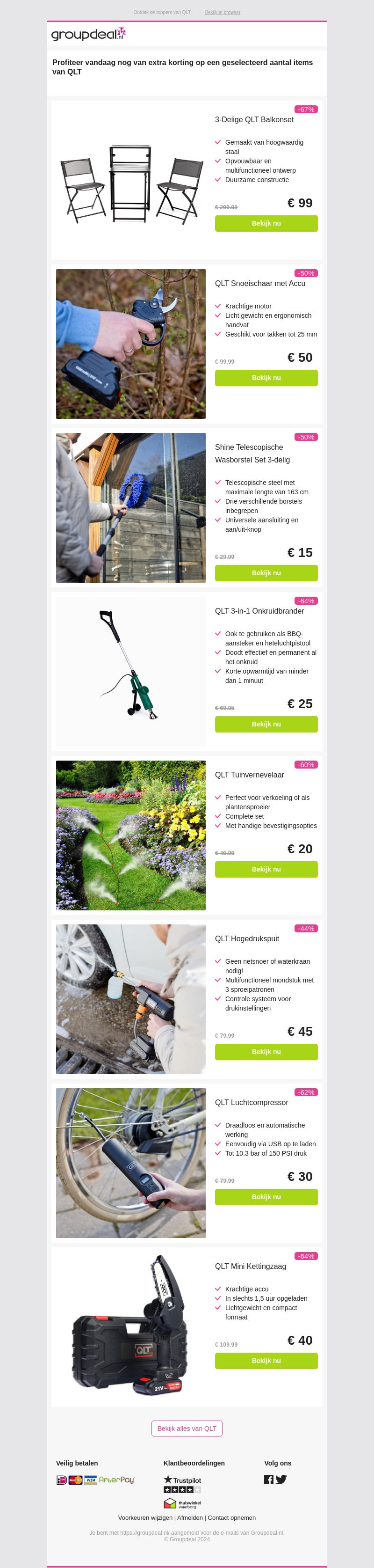 Mis deze geweldige aanbieding niet! Ontvang hoge kortingen op kwalitatieve QLT producten zoals balkonsets, snoeischaren, en hogedrukspuiten. Perfect voor huiseigenaren die hun buitenruimte willen verbeteren. Bekijk snel de deals en bespaar vandaag nog!
