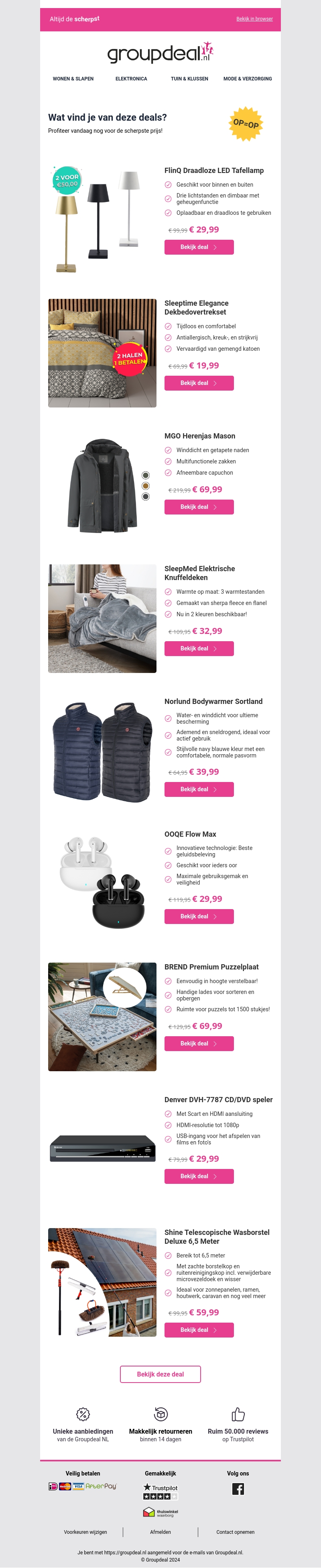 Bekijk de nieuwste aanbiedingen van Groupdeal. Van draadloze tafellampen en dekbedden tot modieuze herenjassen en handige elektrische dekens. Geniet van kwaliteitsproducten tegen scherpe prijzen. Mis de deals niet en shop vandaag nog voordelig!