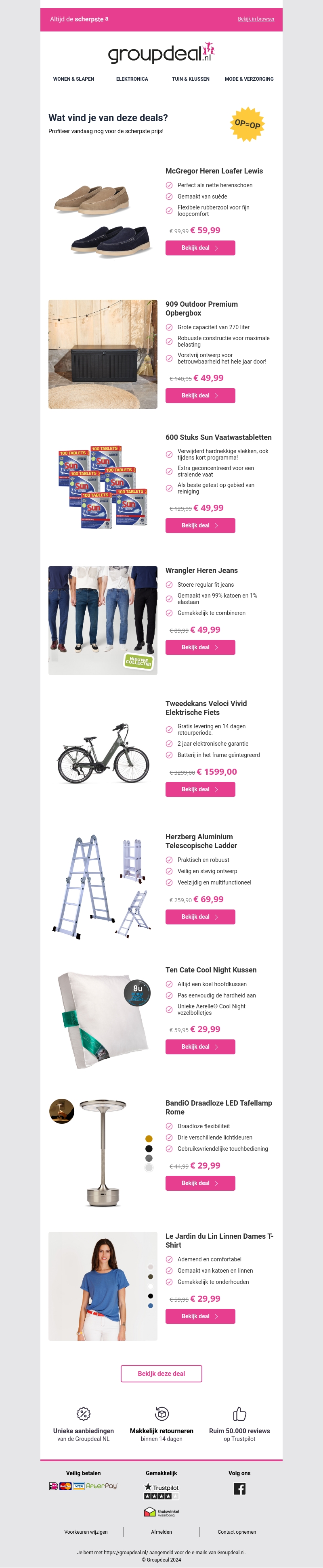 Bekijk de nieuwste groepsaanbiedingen en kortingen op mode, elektronica, woninginrichting en meer. Vandaag profiteer je van scherpe prijzen op items zoals herenschoenen, vaatwastabletten, jeans en nog veel meer.