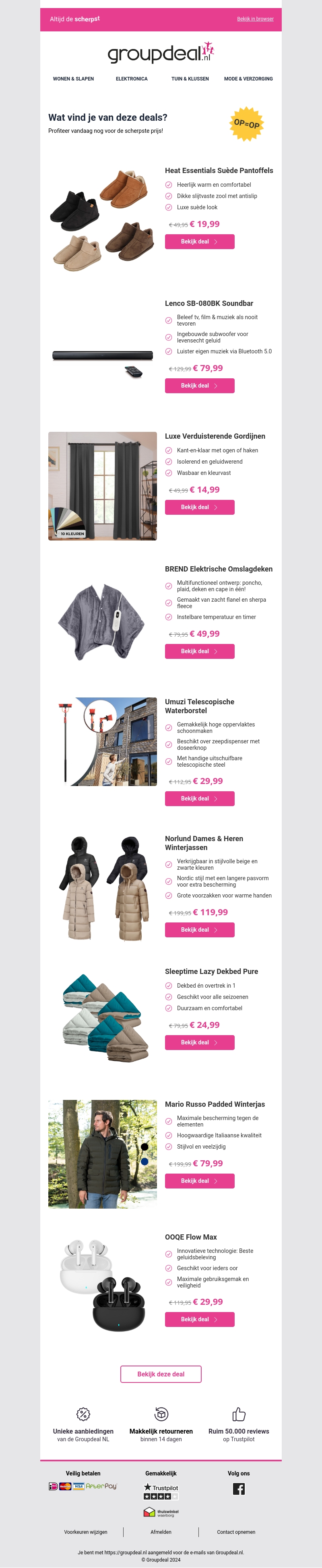 Verken de nieuwste aanbiedingen met een verscheidenheid aan producten van winterjassen tot elektronische gadgets. Profiteer van scherpe prijzen op items zoals luxe verduisterende gordijnen, comfortabele pantoffels en een innovatieve soundbar. Mis deze kans niet om te besparen op hoogwaardige items. Bekijk nu de deals bij Groupdeal en pak je voordeel.