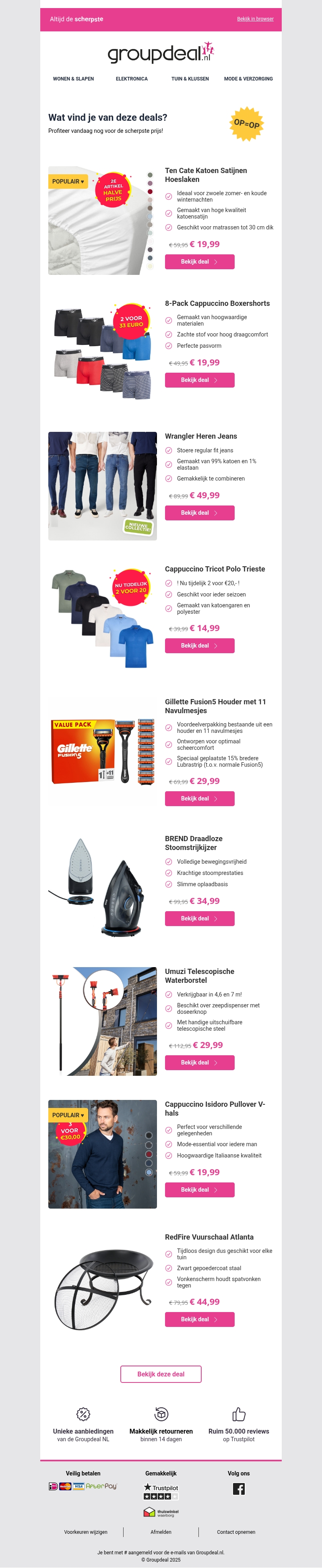 Elke dag de beste deals speciaal voor jou geselecteerd! Ontdek de geweldige kortingen op katoenen hoeslaken, boxershorts, jeans, en meer. Mis de kans niet om gebruik te maken van deze fantastische aanbiedingen en bespaar flink op je aankopen. Sla je slag voordat het te laat is!