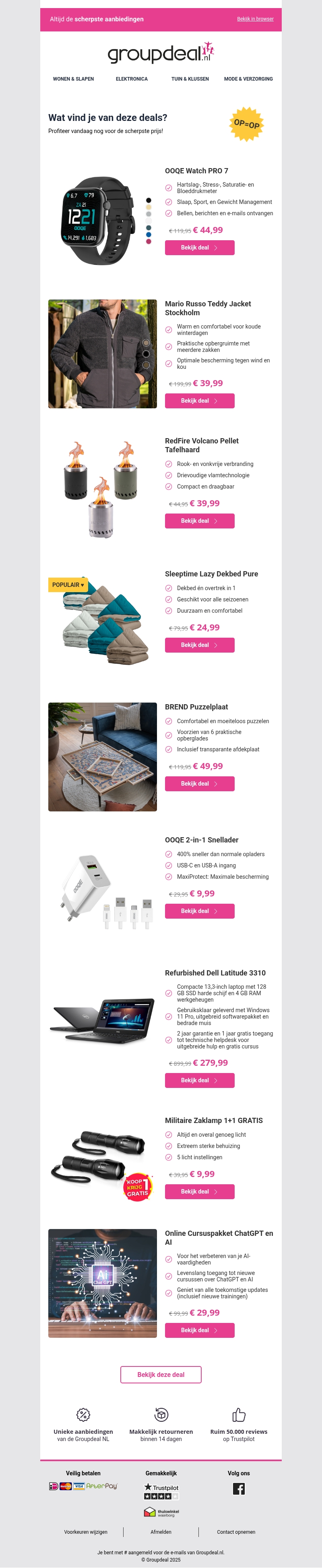 Mis de kans niet om te besparen met de nieuwste dagdeals van Groupdeal.nl. Van een geavanceerd horloge en een comfortabele teddyjas tot een handige 2-in-1 oplader, er zijn diverse producten beschikbaar tegen gereduceerde prijzen. Ontvang exclusieve aanbiedingen zoals een gratis zaklamp bij aankoop of verken nieuwe technologie met het ChatGPT en AI cursusaanbod. Haal snel voordeel uit deze aanbiedingen voordat ze op zijn!