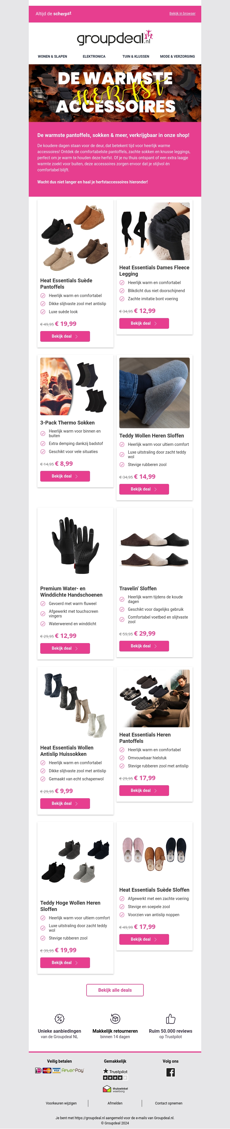 Ontdek de warmste herfstaccessoires bij Groupdeal, ideaal voor de koude dagen. Van comfortabele pantoffels tot winddichte handschoenen, blijf warm en stijlvol. Profiteer van aanbiedingen en geniet van de beste kwaliteit voor een zachte prijs.