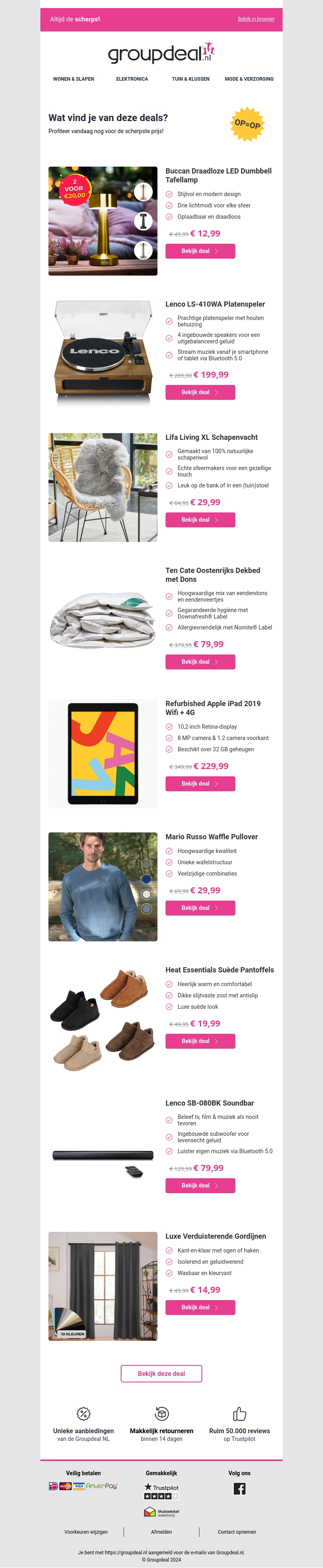 Mis deze kans niet om te besparen op een selectie van stijlvolle en handige producten. Van LED tafellampen tot luxe beddengoed, er is voor ieder wat wils. Zorg dat je snel bent, want sommige deals zijn beperkt beschikbaar. Ontdek ook de nieuwste elektronische apparaten en woningdecoratie. Geniet van de beste aanbiedingen en verbeter je leefruimte vandaag nog.