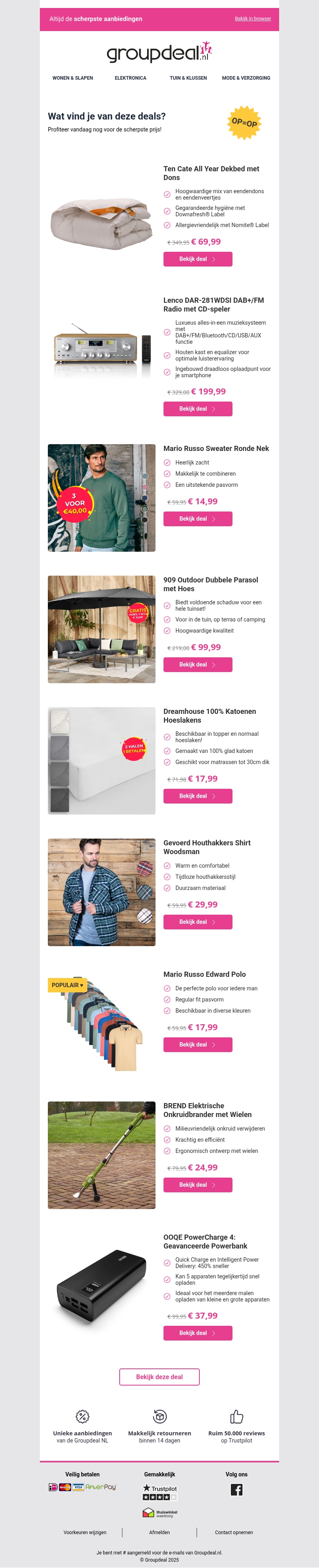 Beleef de beste aanbiedingen met Groupdeal! Vanaf nu profiteer je van topkwaliteit dekbedden, stijlvolle kleding en handige elektronica tegen ongekende prijzen. Mis de hoge kortingen niet op diverse producten zoals de Mario Russo sweater, een geavanceerde powerbank en nog veel meer. Bekijk nu onze aantrekkelijke deals en shop jouw favorieten! Wees er snel bij, want op is op!