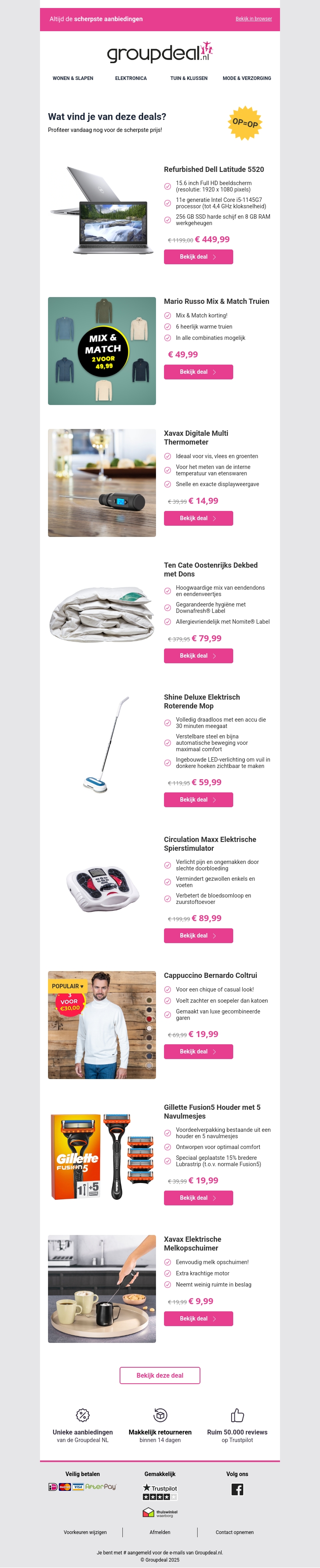 Deze nieuwsbrief zit boordevol aantrekkelijke aanbiedingen op uiteenlopende producten zoals laptops, kleding en meer. Profiteer vandaag nog van scherpe prijzen op topmerken. Mis deze unieke kans niet om voordelig in te slaan. Of je nu op zoek bent naar elektronica, mode of huishoudelijke apparaten, hier vind je alles wat je nodig hebt. Bekijk snel de deals en pak jouw voordeel!