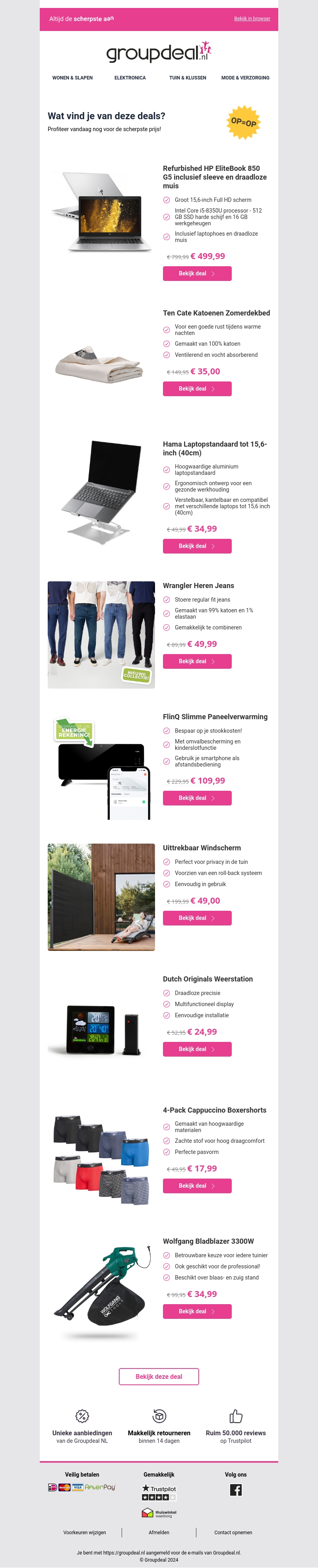Ontvang de beste deals en kortingen bij Groupdeal.nl. Deze week bieden wij kortingen op hoogwaardige refurbished laptops, katoenen zomerdekens, heren jeans, slimme panelenverwarming, uitrekbare windschermen, weerstations, boxershorts en bladblazers. Wacht niet te lang, op=op!