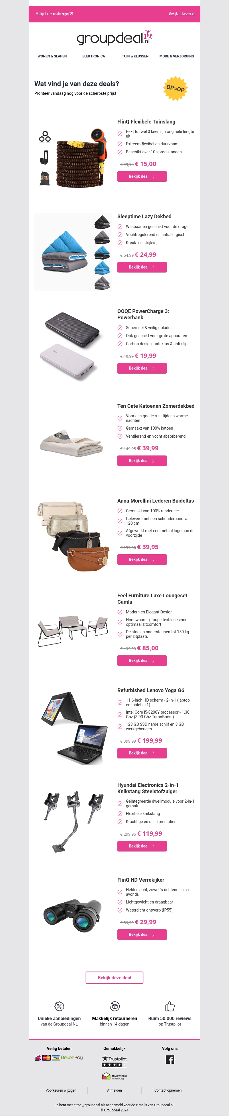 Bekijk de nieuwste aanbiedingen van Groupdeal en bespaar flink op diverse producten. Van flexibele tuinslangen tot luxe loungesets, er is voor ieder wat wils. Mis deze kans niet en shop nu met korting!