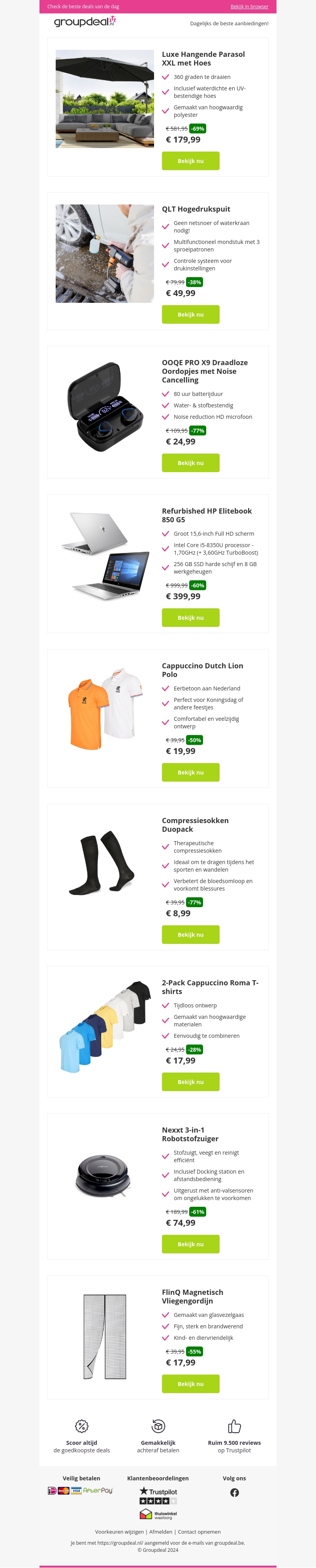Profiteer van geweldige kortingen met onze nieuwste aanbiedingen! Ontvang een luxe hangende parasol met hoes, een multifunctionele QLT hogedrukspuit, en de OOQE PRO X9 draadloze oordopjes met noise cancelling, allemaal tegen scherpe prijzen. Andere topdeals zijn onder andere een refurbished HP Elitebook, stijlvolle Dutch Lion polo’s, en een innovatieve Next 3-in-1 robotstofzuiger.