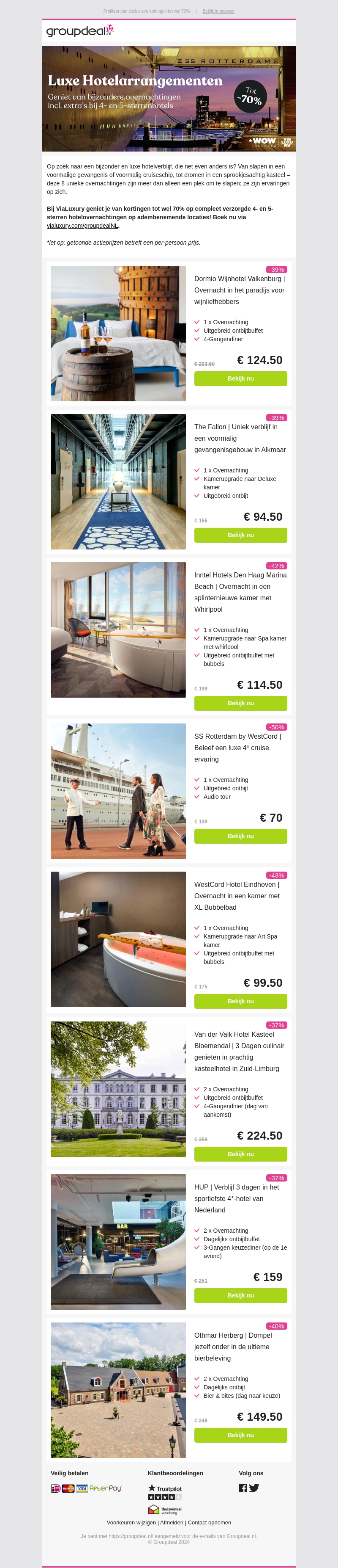 Ontdek een scala aan luxe hotelarrangementen met kortingen tot 70%. Van overnachten in voormalige gevangenissen tot verblijven in prachtige kastelen, er is voor ieder wat wils. Of je nu op zoek bent naar een romantisch uitje of een avontuurlijk verblijf, hier vind je de perfecte optie.