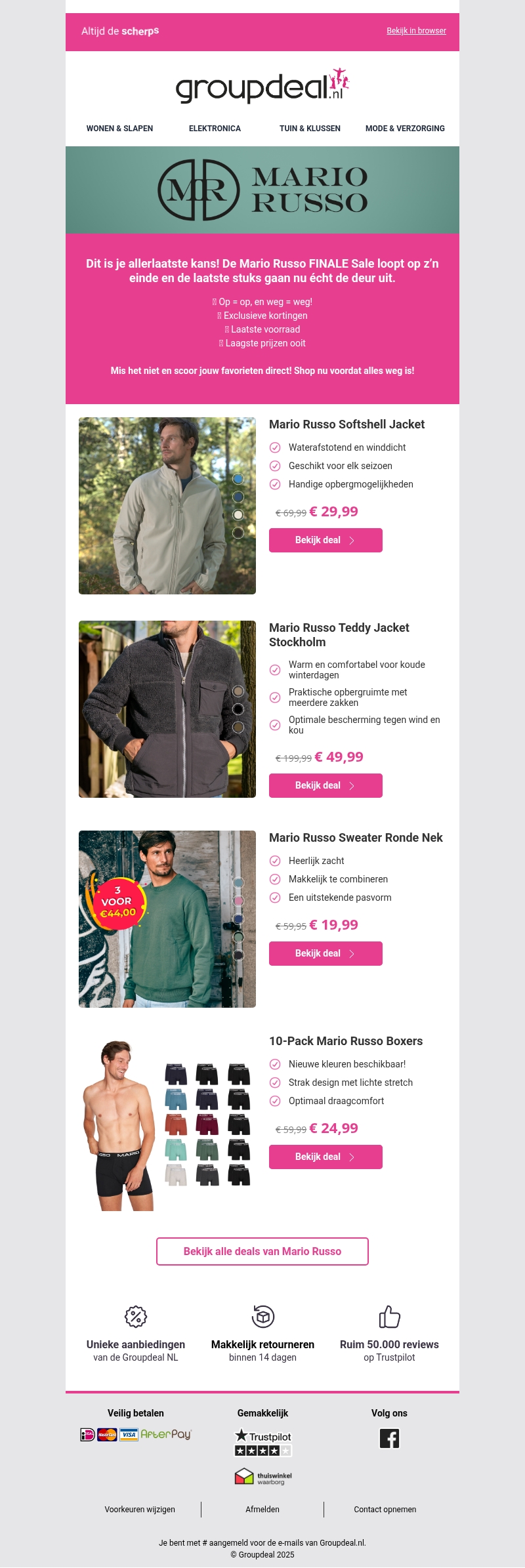Profiteer van de allerlaatste deals in de Mario Russo Finale Sale! Ontvang exclusieve kortingen op de laatste voorraad van stijlvolle items zoals jassen, truien en boxers. Deze aanbiedingen zijn perfect voor elk seizoen, met waterafstotende en winddichte materialen. Vind het ultieme draagcomfort en een uitstekende pasvorm. Sla snel je slag voordat alles weg is!