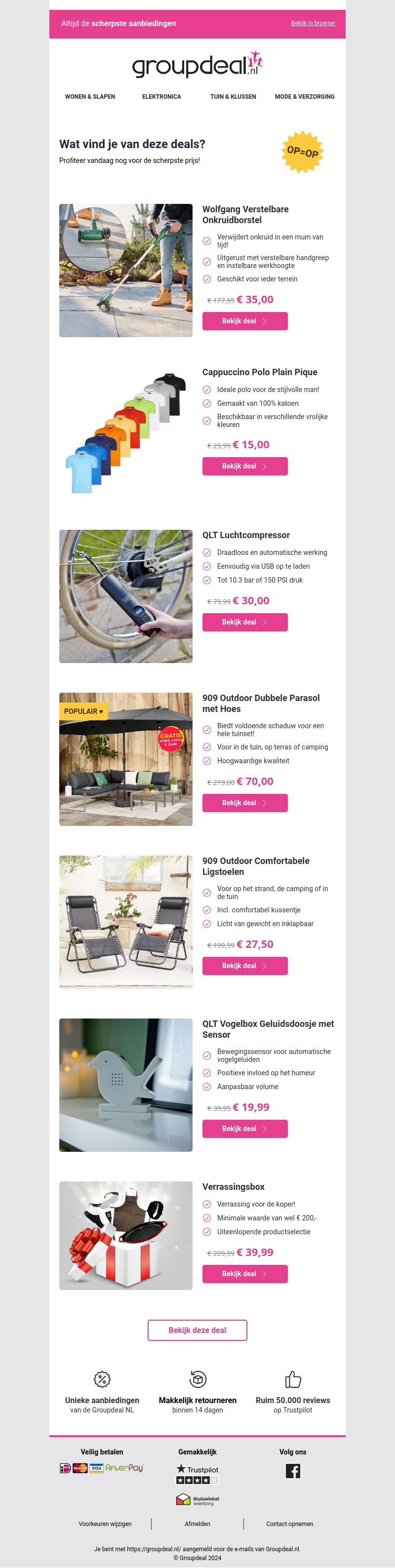 Mis deze geweldige deals niet! Van een verstelbare onkruidborstel tot comfortabele ligstoelen, we hebben alles wat je nodig hebt. Profiteer van scherpe kortingen op diverse producten. Ook hebben we een verrassingsbox die vol zit met mysterieuze items. Shop nu en ontdek jouw favorieten!