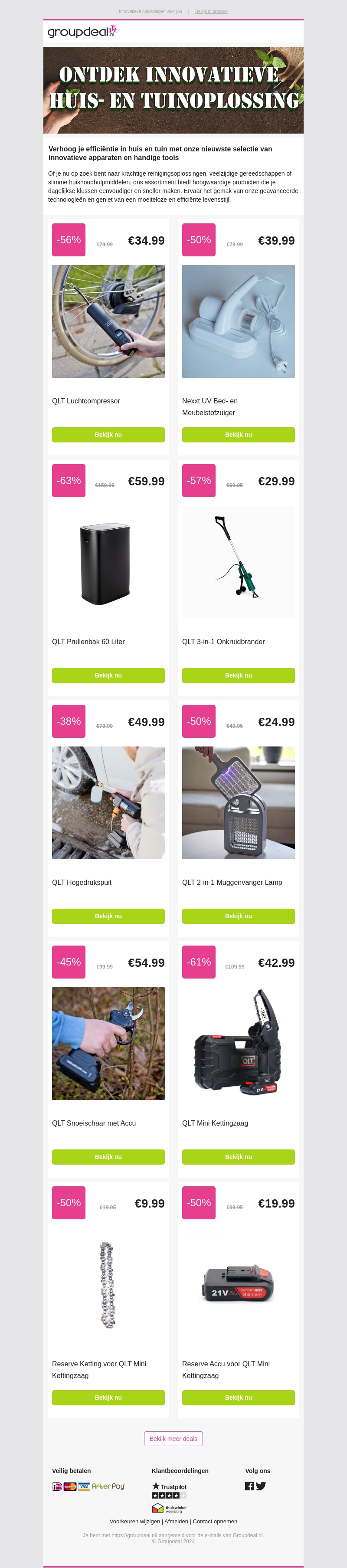 Verhoog je efficiëntie in huis en tuin met onze nieuwste selectie van innovatieve apparaten en handige tools. Van luchtcompressors tot snoeischaren, ontdek producten die je dagelijkse klussen makkelijker maken. Profiteer nu van grote kortingen tot wel 63% op geselecteerde items.