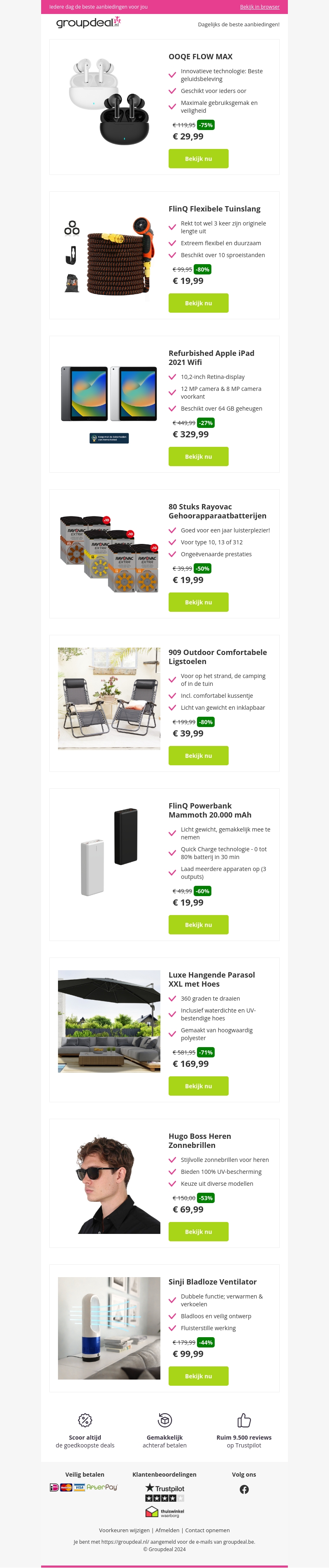 Bekijk de nieuwste deals op de OOQE Flow Max oordopjes voor €29,99, de FlinQ Flexibele Tuinslang voor €19,99, en een refurbished Apple iPad 2021 Wifi voor €329,99. Profiteer van kortingen op diverse producten zoals de FlinQ Powerbank, luxe hangende parasol, comfortabele ligstoelen en meer.