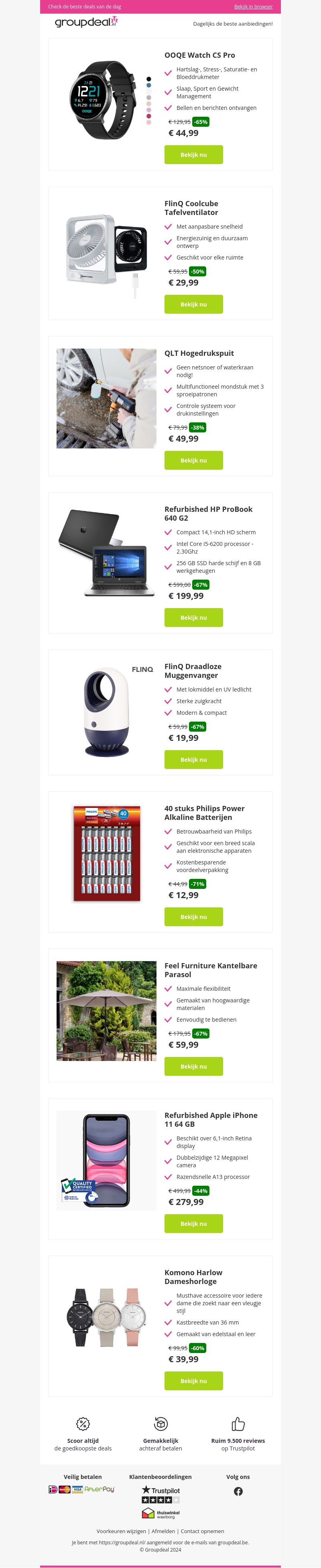 Bekijk de nieuwste aanbiedingen op Groupdeal.nl! Van slimme horloges en tafelventilatoren tot hogedrukspuiten en refurbished elektronica, er is voor ieder wat wils. Mis deze deals niet en bespaar vandaag nog!