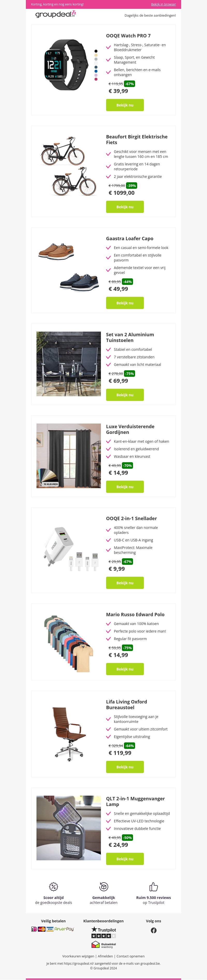 Ontdek de nieuwste deals bij Groupdeal met kortingen tot wel 75%. Koop de OOQE Watch Pro 7 voor €39,99, een Beaufort Birgit Elektrische Fiets voor €1099,00, en stijlvolle Gaastra Loafers vanaf €49,99. Mis ook niet de luxe verduisterende gordijnen en handige 2-in-1 snellader.