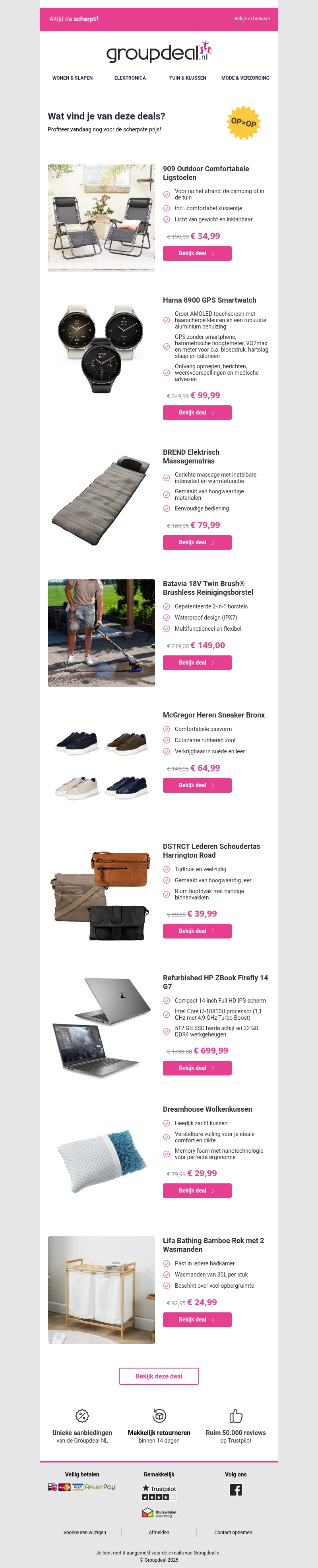 Mis deze geweldige aanbiedingen niet bij Groupdeal! Van comfortabele ligstoelen tot slimme gadgets, we hebben alles wat je zoekt tegen de scherpste prijzen. Bekijk onze selectie van elektrische massagematrassen en stijlvolle leren schoudertassen. Profiteer vandaag nog van deze exclusieve deals voordat ze verdwijnen!