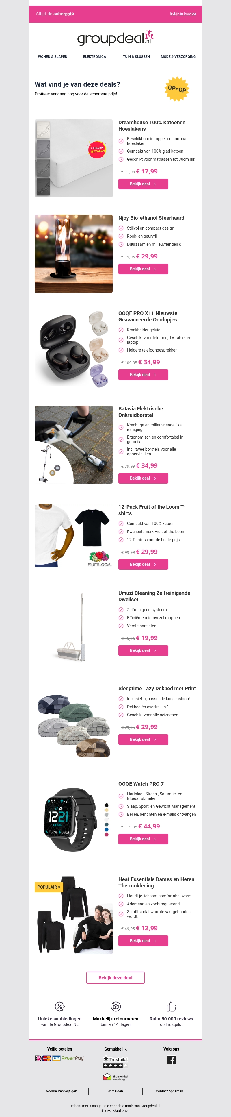 Verlies geen tijd en ontdek de meest scherpe deals van vandaag! Van hoogwaardige katoenen hoeslakens tot de nieuwste oordopjes, er is voor ieder wat wils. Bekijk ook onze stijlvolle sfeerhaard en praktische schoonmaakspullen. Bovendien biedt onze selectie van mode en accessoires alles wat je nodig hebt om indruk te maken, allemaal voor geweldige prijzen. Mis deze unieke aanbiedingen niet en shop nu!