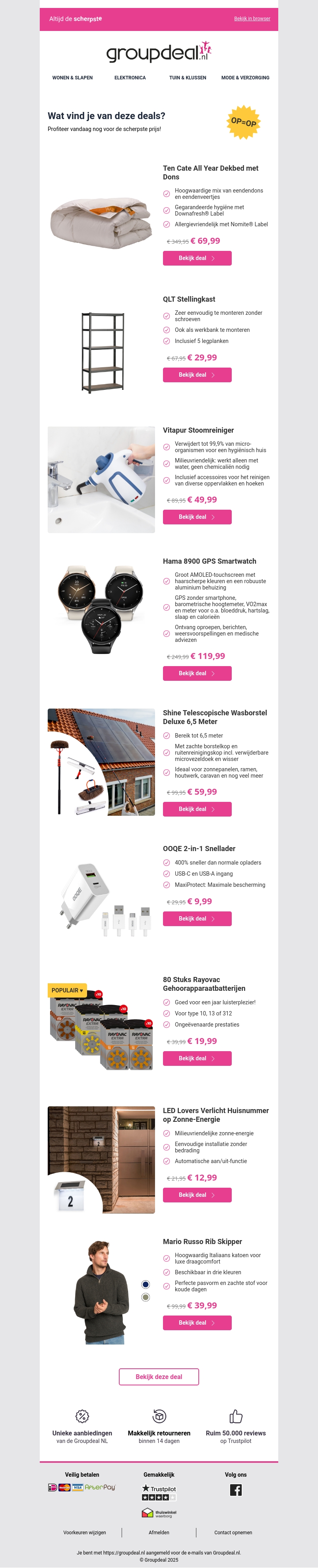 Haal het meeste uit deze unieke deals op Groupdeal.nl, van luxe dekbedden en slimme gadgets tot huishoudelijke must-haves. Profiteer van exclusieve kortingen op ons hoogwaardige aanbod, variërend van donsdekens tot GPS smartwatches. Mis de kans niet om uw huis, tuin, of garderobe aan te vullen met deze fantastische aanbiedingen. Pak deze deals voordat ze verdwijnen en shop met vol vertrouwen. Ontdek nu geweldige besparingsmogelijkheden met Groupdeal!