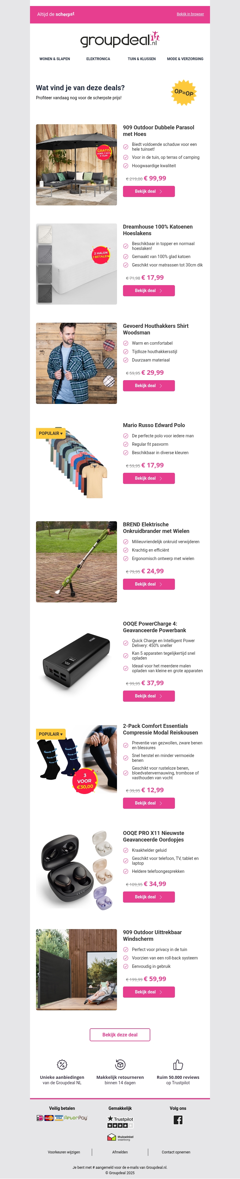 Verwen uzelf met de nieuwste aanbiedingen van Groupdeal. Van stijlvolle kleding tot handige gadgets, deze deals zijn perfect voor iedereen. Profiteer van de scherpe kortingen op producten als de 909 Outdoor Parasol of het Gevoerde Houthakkers Shirt. Mis deze unieke kans niet om kwaliteitsproducten tegen lage prijzen te scoren. Bekijk alle kansen vandaag nog! Deze aanbiedingen zijn tijdelijk, dus wees snel!