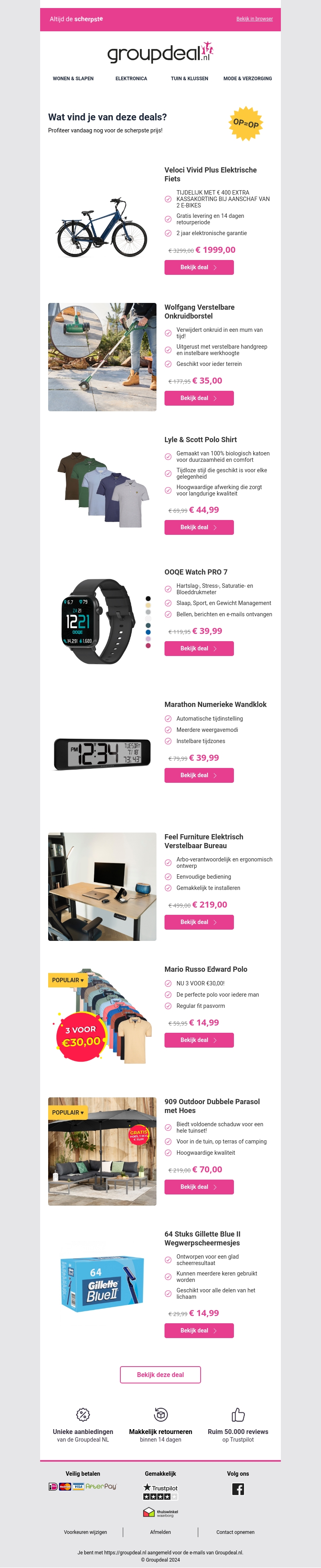 Heeft u onze aanbiedingen van deze week al gezien? Mis deze kans niet om te profiteren van geweldige kortingen op een verscheidenheid aan producten zoals elektrische fietsen, kleding, horloges, en meer. Alle producten worden snel en gemakkelijk bij u thuis geleverd. Bekijk de deals en bespaar vandaag nog bij Groupdeal.nl!